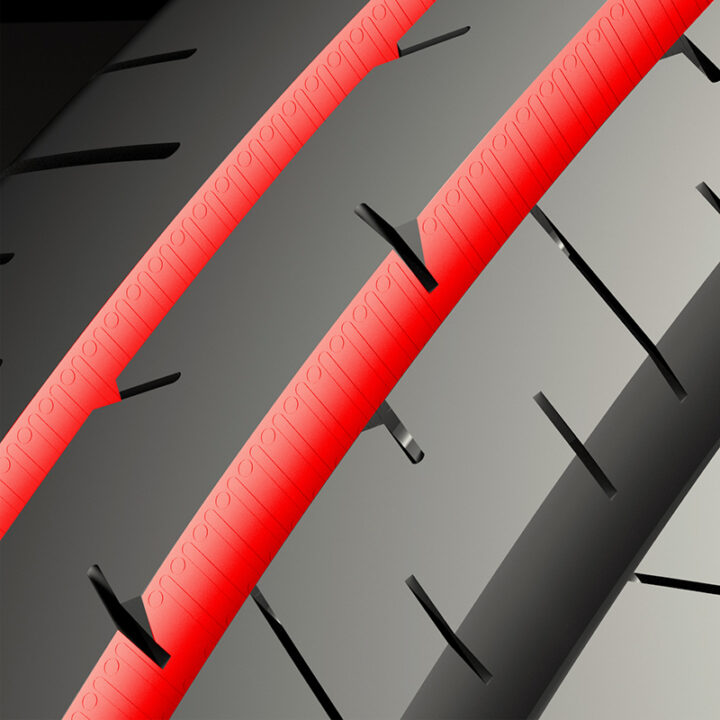 These four grooves, which span the circumference of the tire, work in conjunction with the lateral grooves to evacuate water rapidly, leading to improved handling and traction.