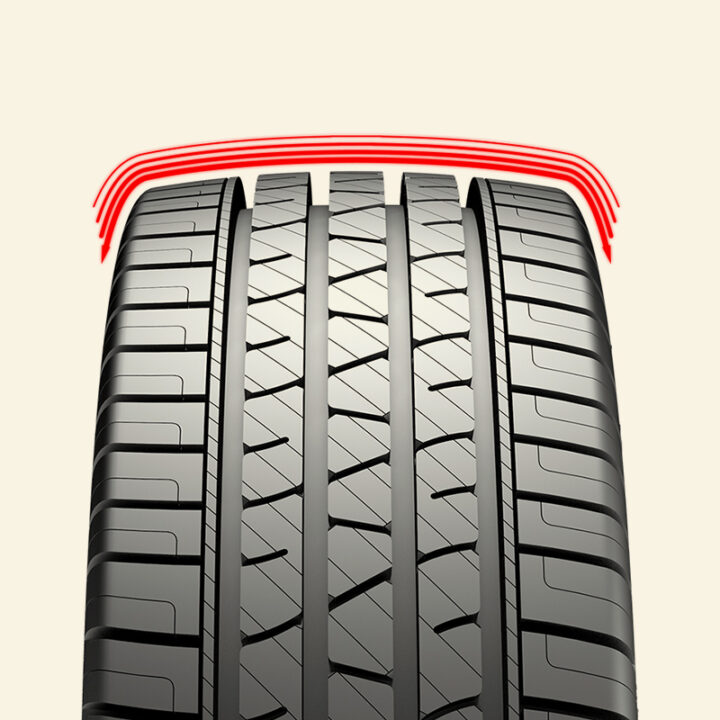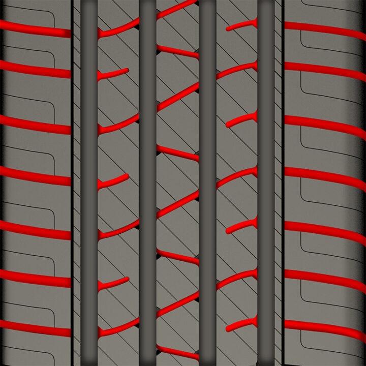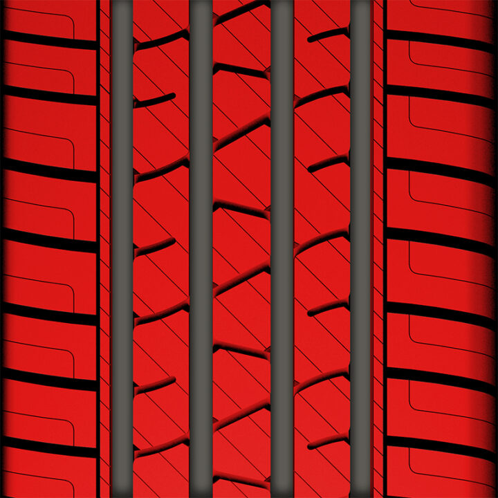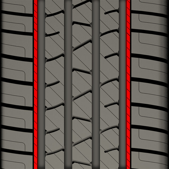 A noise-blocking bar on the tire shoulders delays premature wear and reduces sound that is generated by road traction.